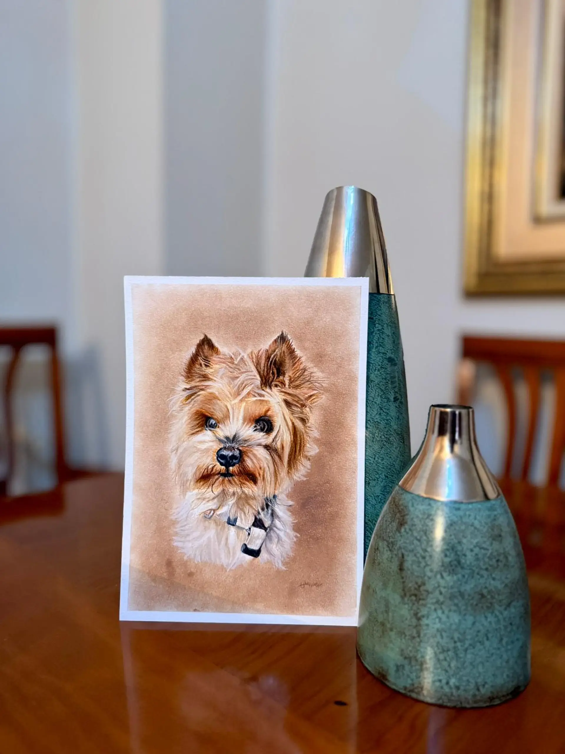 Retrato en pastel y lápices de colores de Popeye, un adorable Yorkshire Terrier con una mirada llena de ternura. Su pelaje dorado y su expresión dulce fueron capturados con todo el detalle que merece.