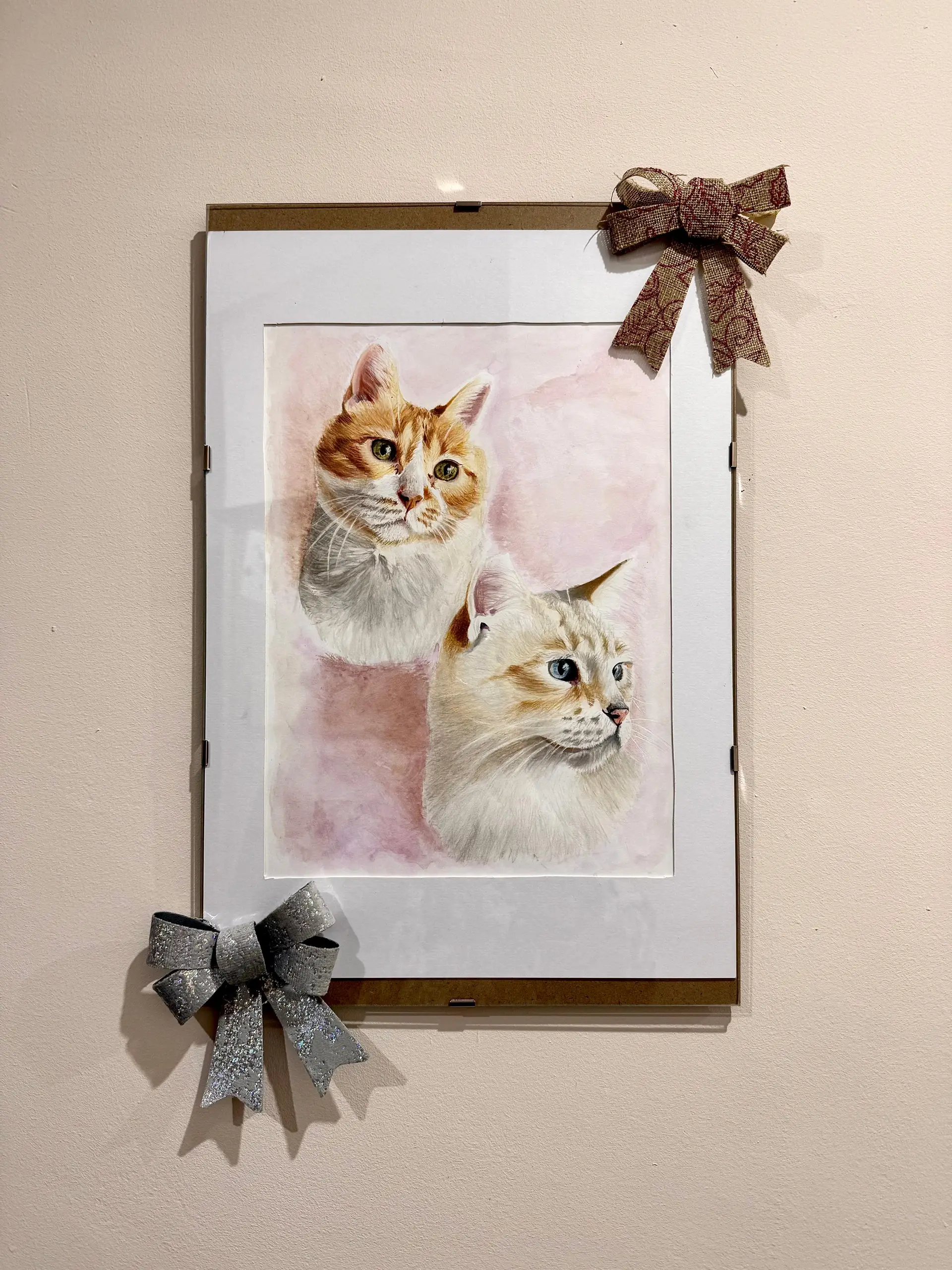 Retrato de Wanda y Nala, dos gatos con personalidades únicas. Capturados con acuarela y lápices de colores para resaltar cada detalle de su belleza.